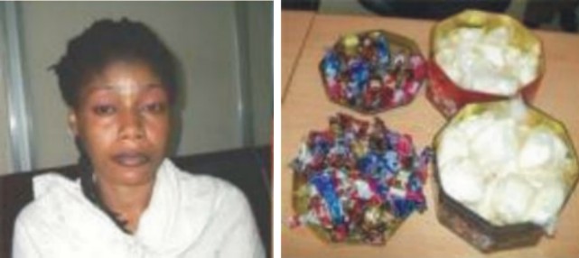 25 year old Bisola Animasaun, a London-based fashion designer, was nabbed with 3 kilogrammes of cocaine concealed in packs of chocolates. She was arrested during screening of passengers on a British Airways flight to London. Thirty sachets of cocaine weighing 3kg was found inside two chocolates containers in her bag.