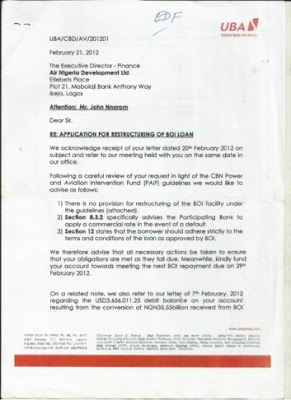That request to have his repayment suspended was a red flag. It signaled that Jimoh Ibrahim had neither intention nor will to honor his obligations. UBA served Air Nigeria notice that the airline could not stop repayment of the loan (see attached letter).