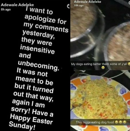 Singer Davido's brother, Adewale Adeleke, has apologized for saying his dogs feed better than some Nigerians and noodles is a food for dog. This is coming after he suffered a backlash for his insensitive statement on Snapchat. It's good he has realized his mistake.