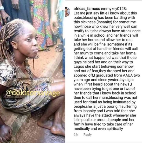 But people who have had personal encounters with Blessing and her family members she has a "challenge". They took to social media to reveal that the 300 level student of the department of Political Science, Adekunle Ajasin University, Akungba in Ondo State who was on her way to Lagos State has been battling with mental crisis.
