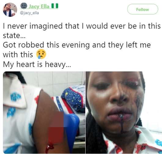 Jacy who in her tweet, said she never knew Port Harcourt had become really dangerous, wrote: "I never imagine that I would ever be in this state... Got robbed this evening and they left me with this...my heart is heavy."